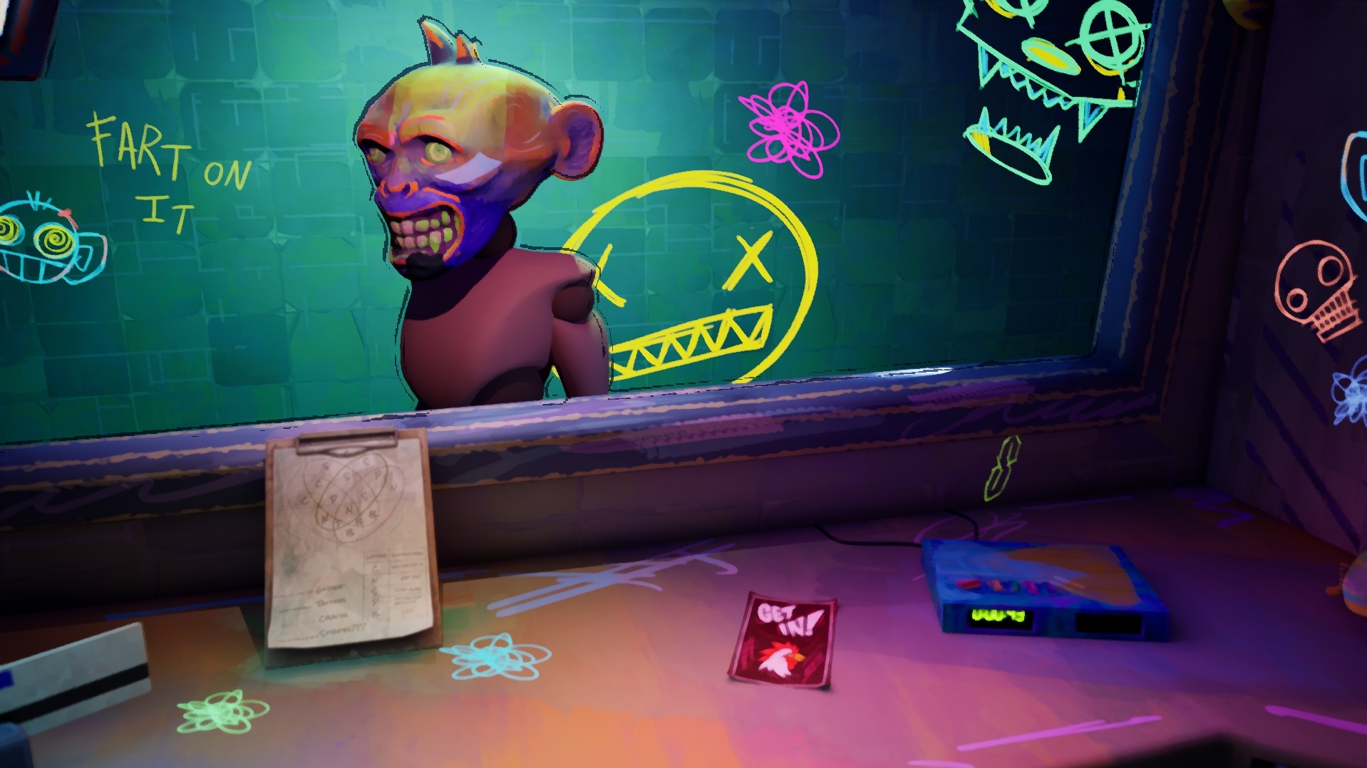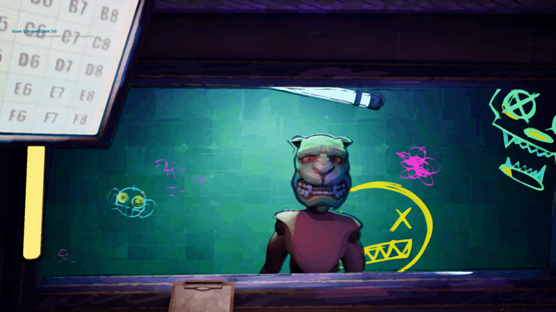 Use your mouse to look up to the mask and zoom it. Use your cheatsheet to know if peoples can enter the club. After deciding press the good element in your office to determine the action.